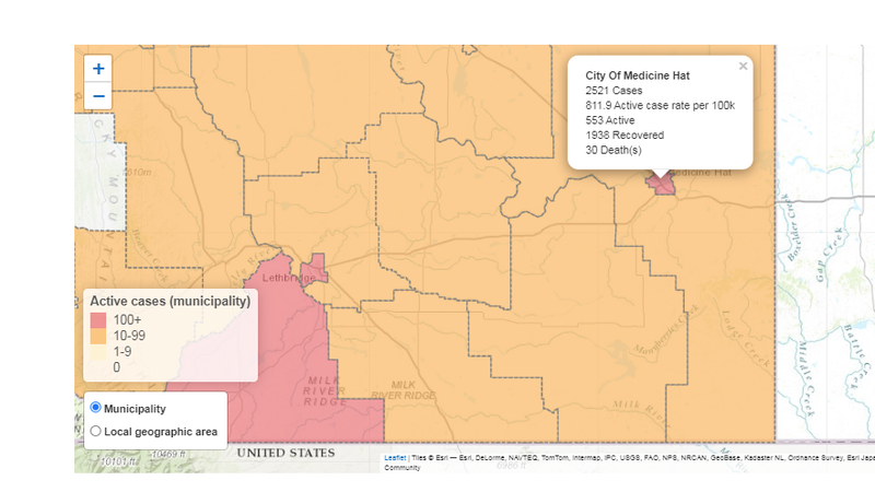 Medicine Hat has had 2,521 total cases – the 553 active, 1,938 recovered and there have been 30 deaths.