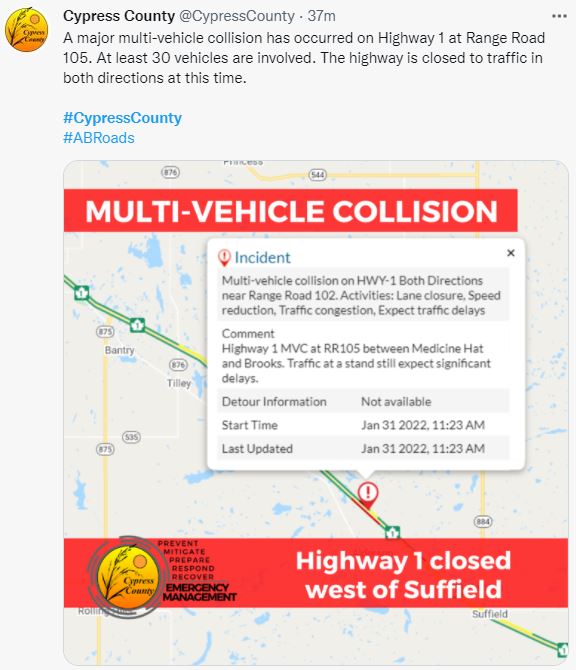 Meanwhile, RCMP were turning around traffic Monday at the Suffield intersection of Highway One, at secondary Highway 884 following several collisions in the area, with flow of traffic halted on the Trans Canada between Range Road 100 and Range Road 110.