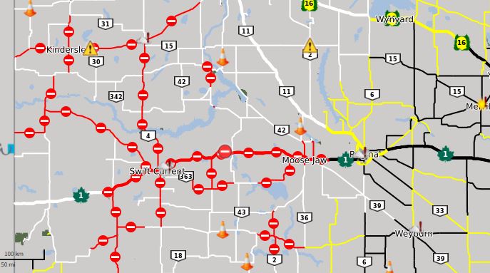 The so-called “Alberta clipper” has brought on poor driving conditions and resulted in the closure of Highway One east of Gull Lake to Moose Jaw, according to a provincial website.