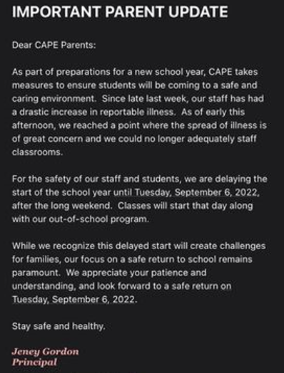 A message was sent to CAPE parents on Sunday evening that reads in part, “since late last week, our staff has had a drastic increase in reportable illness.”