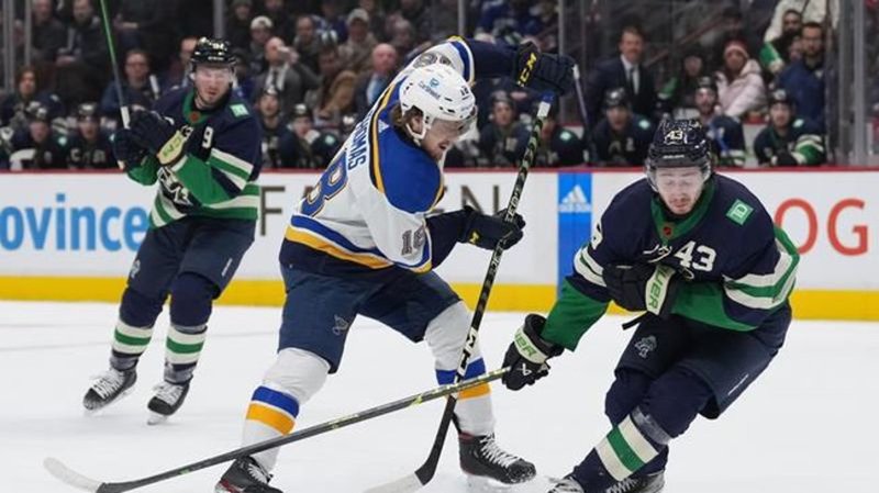 Blues goaltender Jordan Binnington stopped 33 shots. Canuck goalie Spencer Martin made 22 saves.