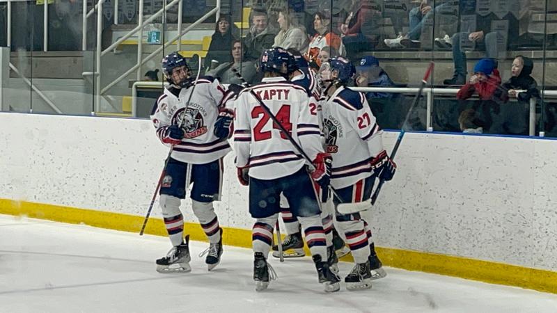 Members of the Okotoks Carstar Bisons celebrating after scoring a goal in game three of the South Division Finals against the Medicine Hat Cubs. (Jacob Varcoe photo)