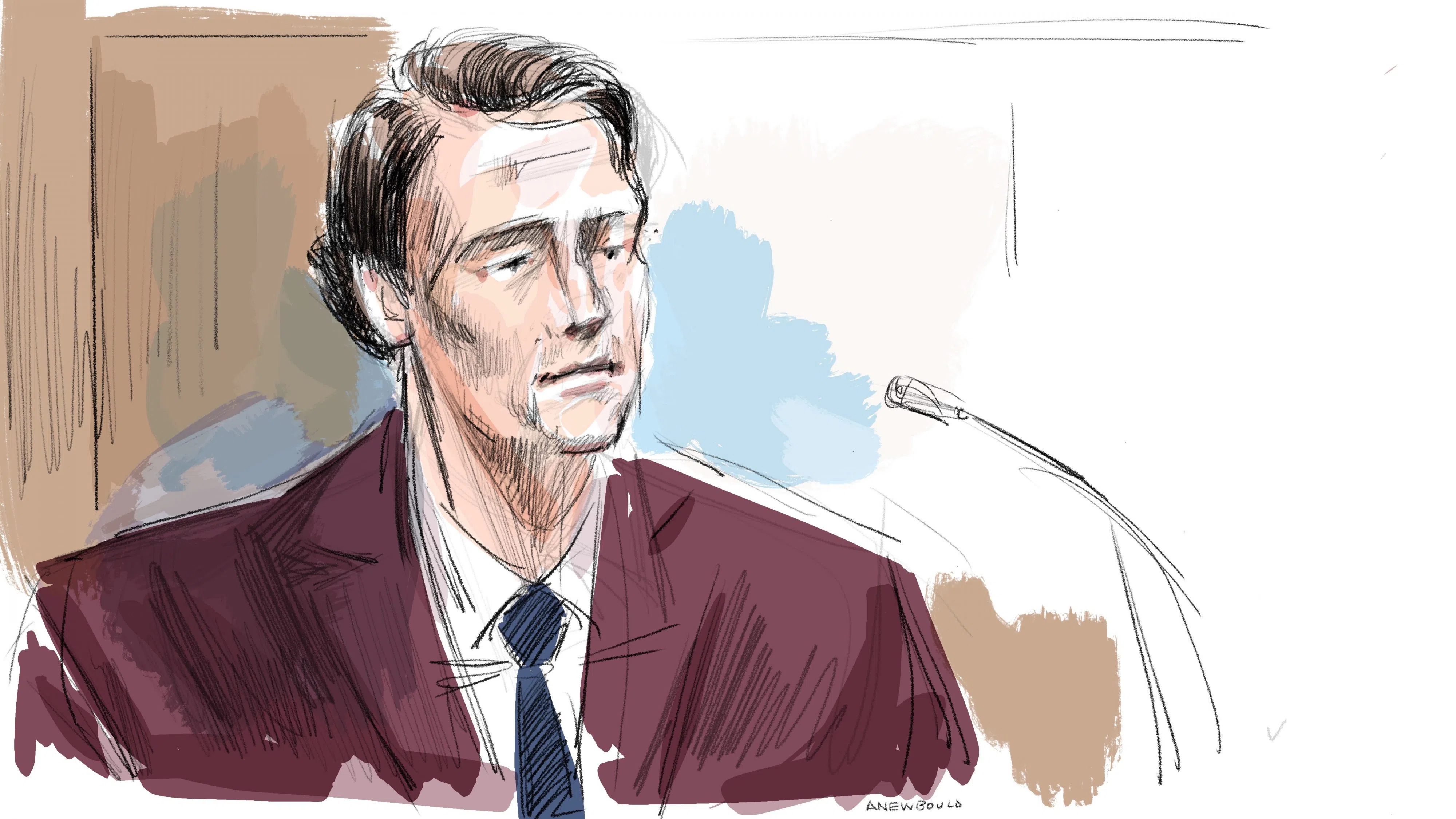 Carter Hart is shown in this courtroom sketch in London, Ont., on Thursday, May 29, 2025. THE CANADIAN PRESS/Alexandra Newbould