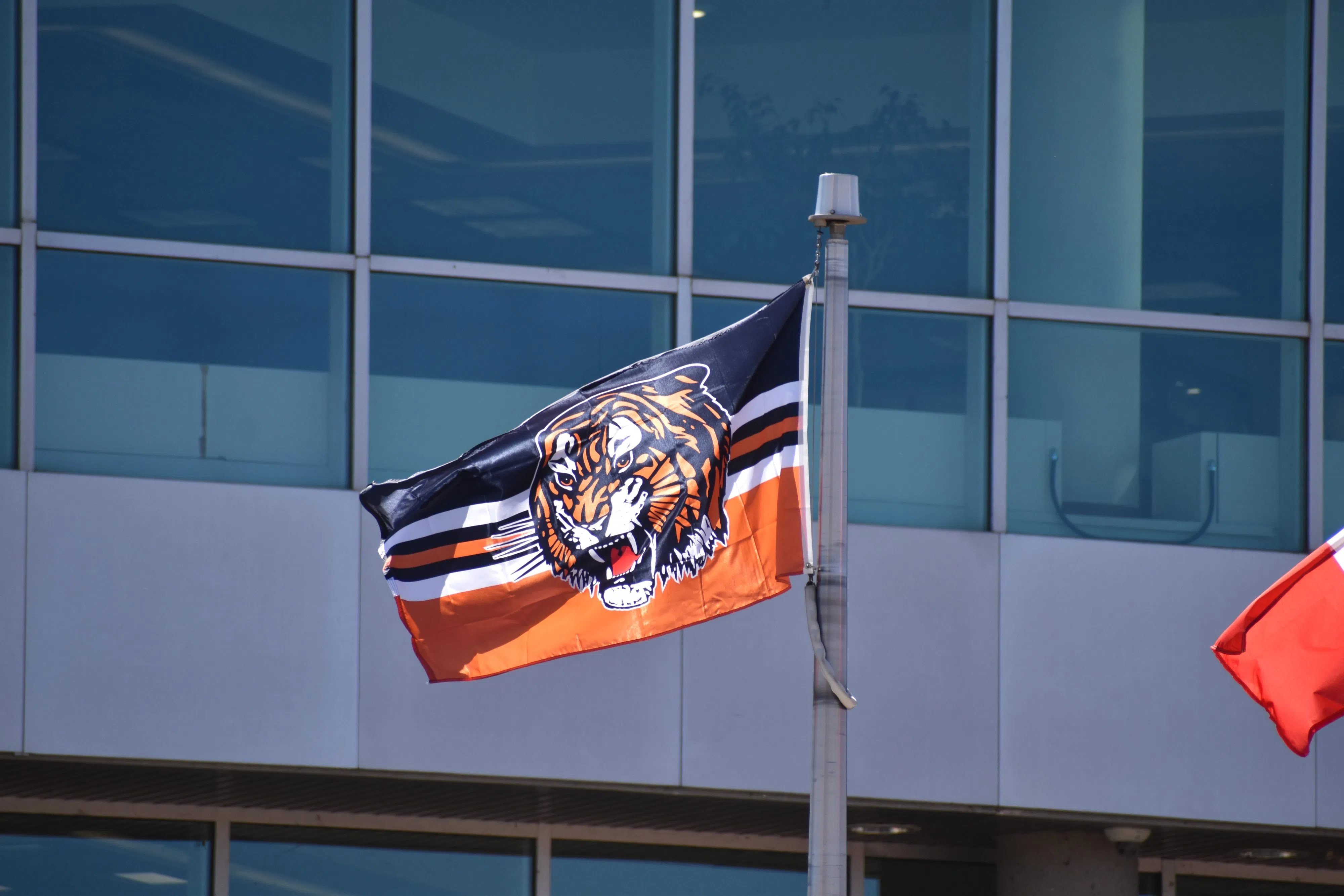The Medicine Hat Tigers flag flies in front of city hall in 2025. Eli J. Ridder/CHAT News