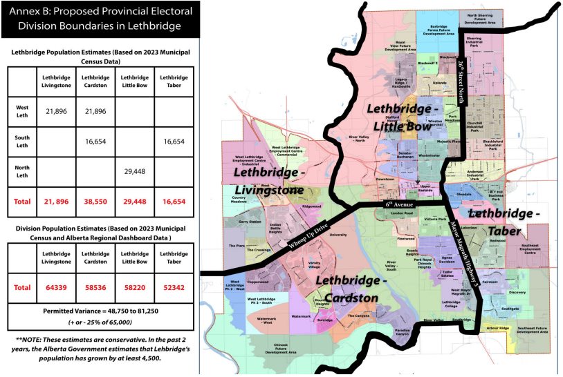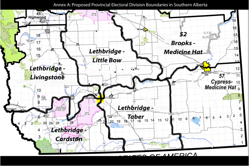The new proposal aims to create rural-urban hybrid ridings that split Lethbridge into four districts, and each would include a large rural area.