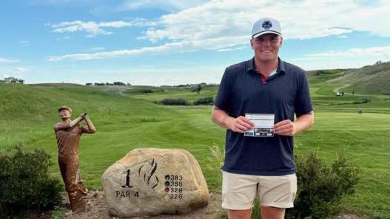Wyatt Bishop of the Medicine Hat College Rattlers' golf team sits in third place at the midway point of the Canadian Collegiate Athletic Association's National Championship at Desert Blume Golf Course...