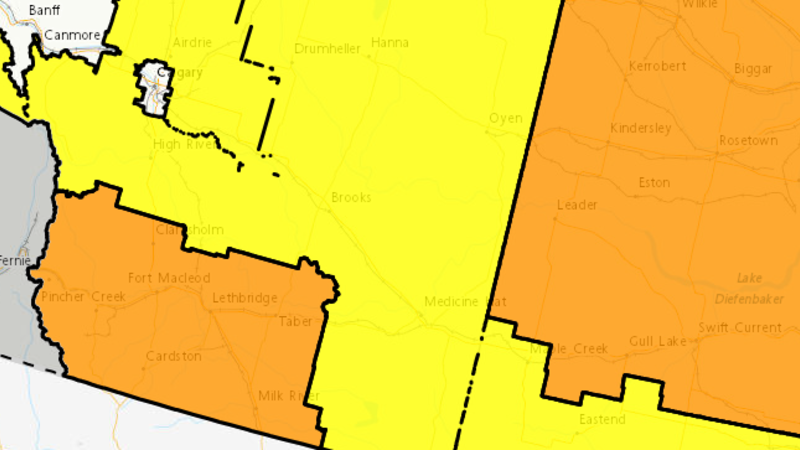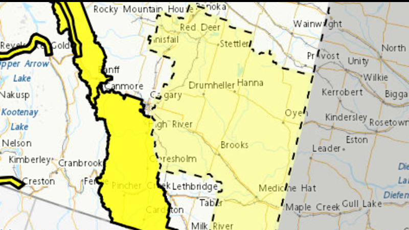 Large areas of Alberta and Saskatchewan are under a wind warning on Wednesday.The Medicine Hat area can expect strong west winds gusting to 100 km/h late in the morning and afternoon.Environment Canad...