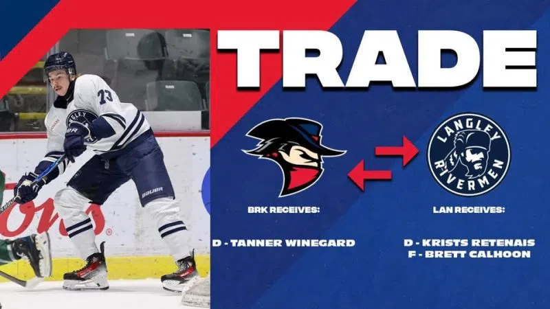 The BCHL's Brooks Bandits have acquired 2005-born defenceman Tanner Winegard from the Langley Rivermen for 2006-born defenceman Krists Retenais and 2005-born forward Brett Calhoon.The 6-foot-6, 225-pound Winegard has appeared in 90 Ontario Hockey League games with the Windsor Spitfires.This season with the Rivermen, he...